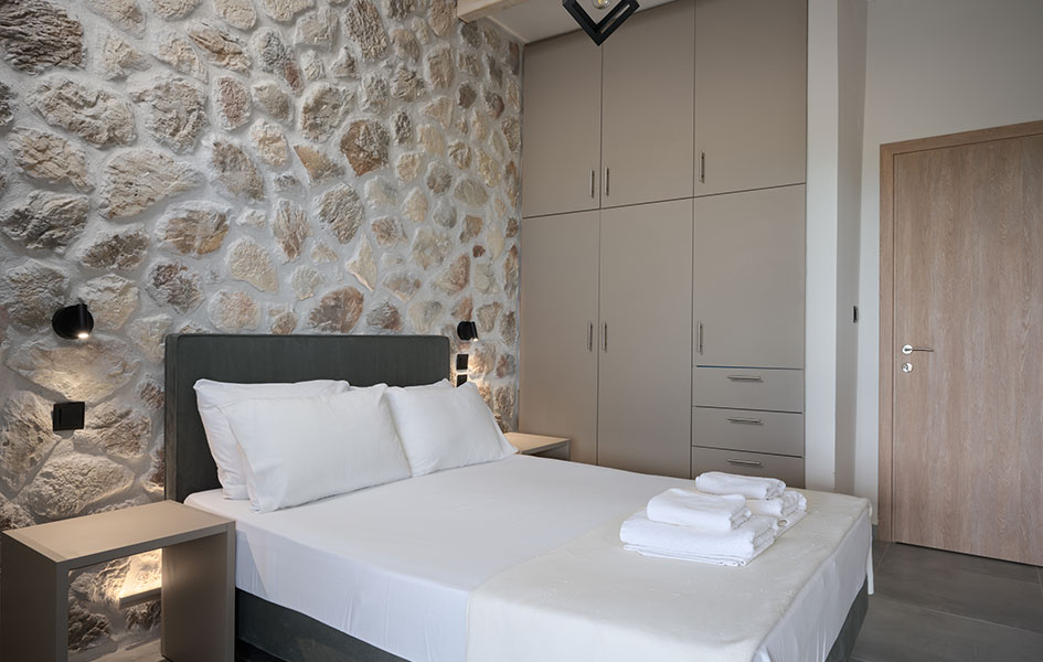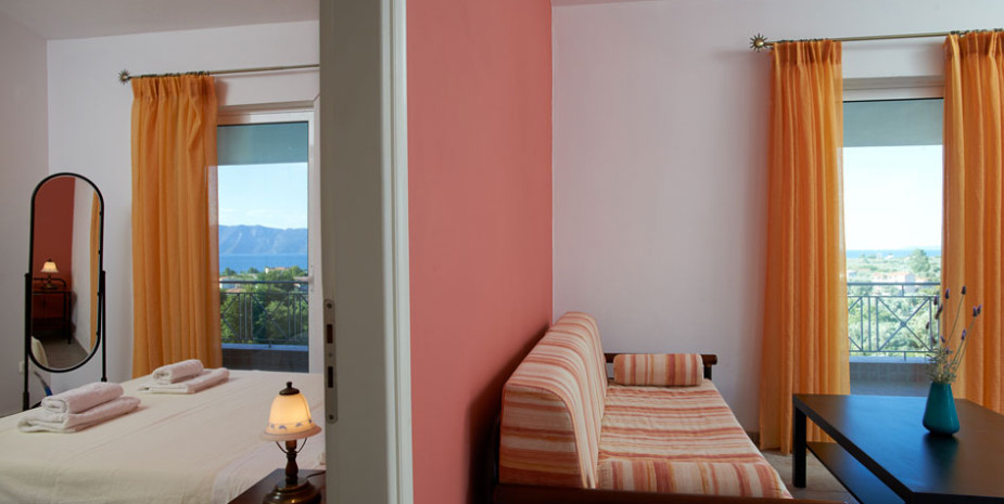 Τα διαμερίσματα διαθέτουν ένα υπνοδωμάτιο με διπλό κρεβάτι και επιπλέον έναν άνετο ενιαίο χώρο που περιλαμβάνει δύο μονά κρεβάτια.Διαθέτουν κουζίνα πλήρως εξοπλισμένη, μεγάλο μπαλκόνι με θέα προς τη θάλασσα. Όλα τα διαμερίσματα έχουν δική τους πρόσβαση και είναι ανεξάρτητα.
